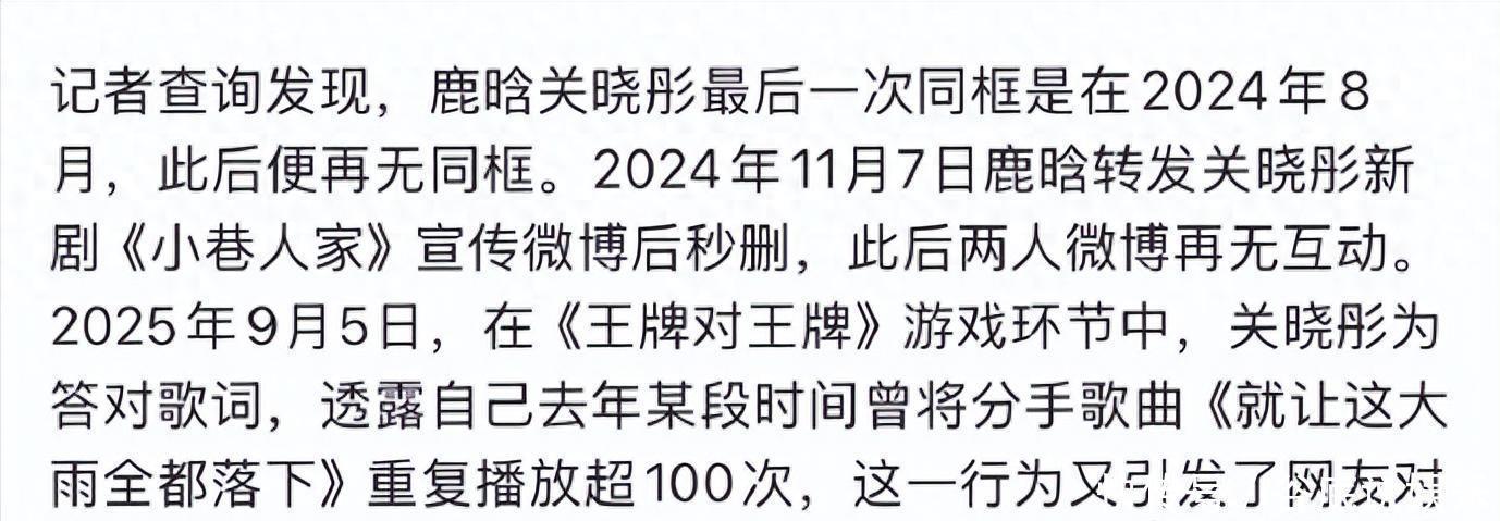 2024日鹿晗转发关晓彤新剧《小巷人家》宣传微博后秒删,此后两人微博再无往来。2025日,关晓彤在《王牌对王牌》中透年某段时间深夜听分手神曲《就让这场大雨落下》次。7年不分手的恋爱,终究是现实赢了青春的心跳!